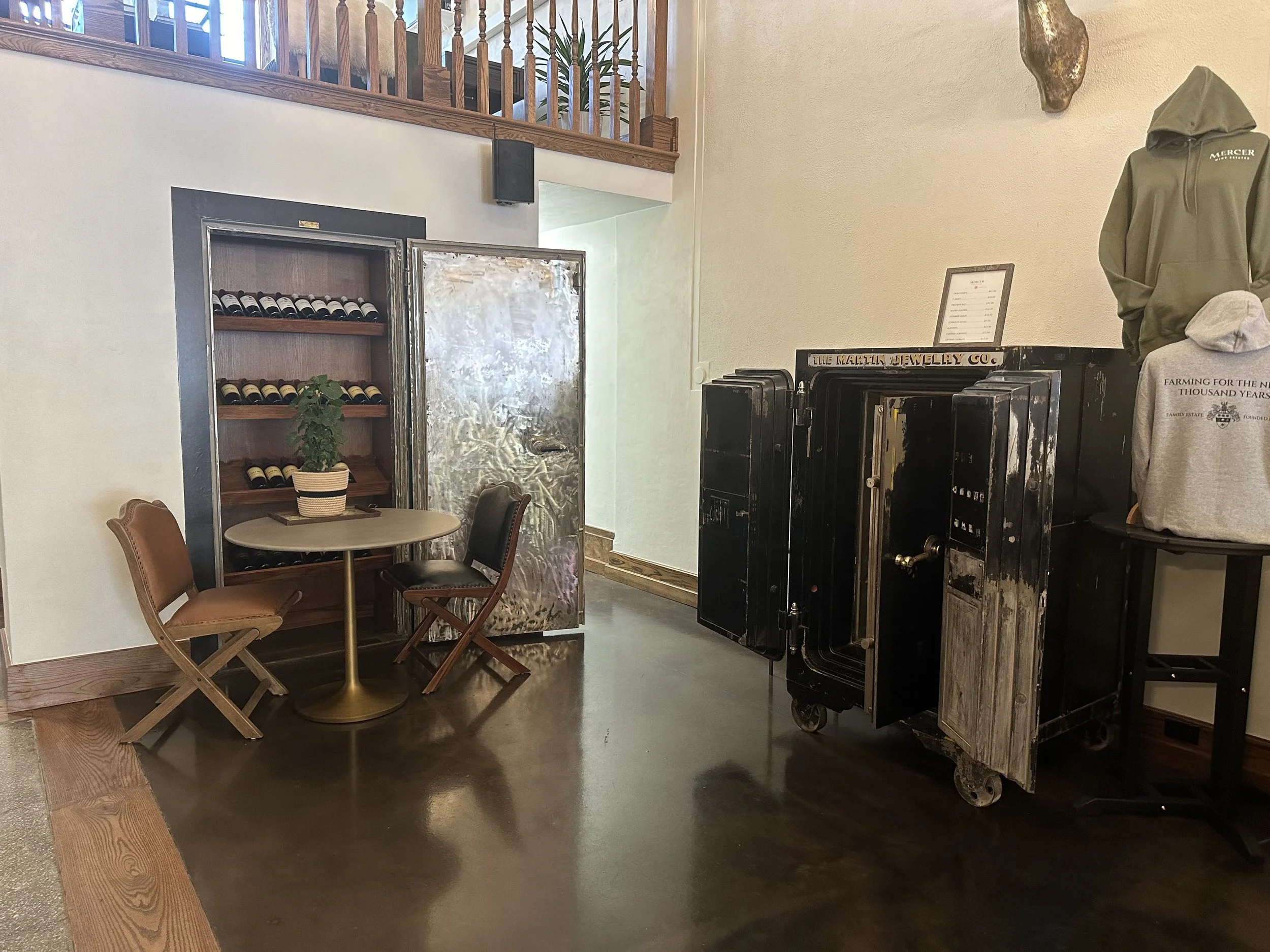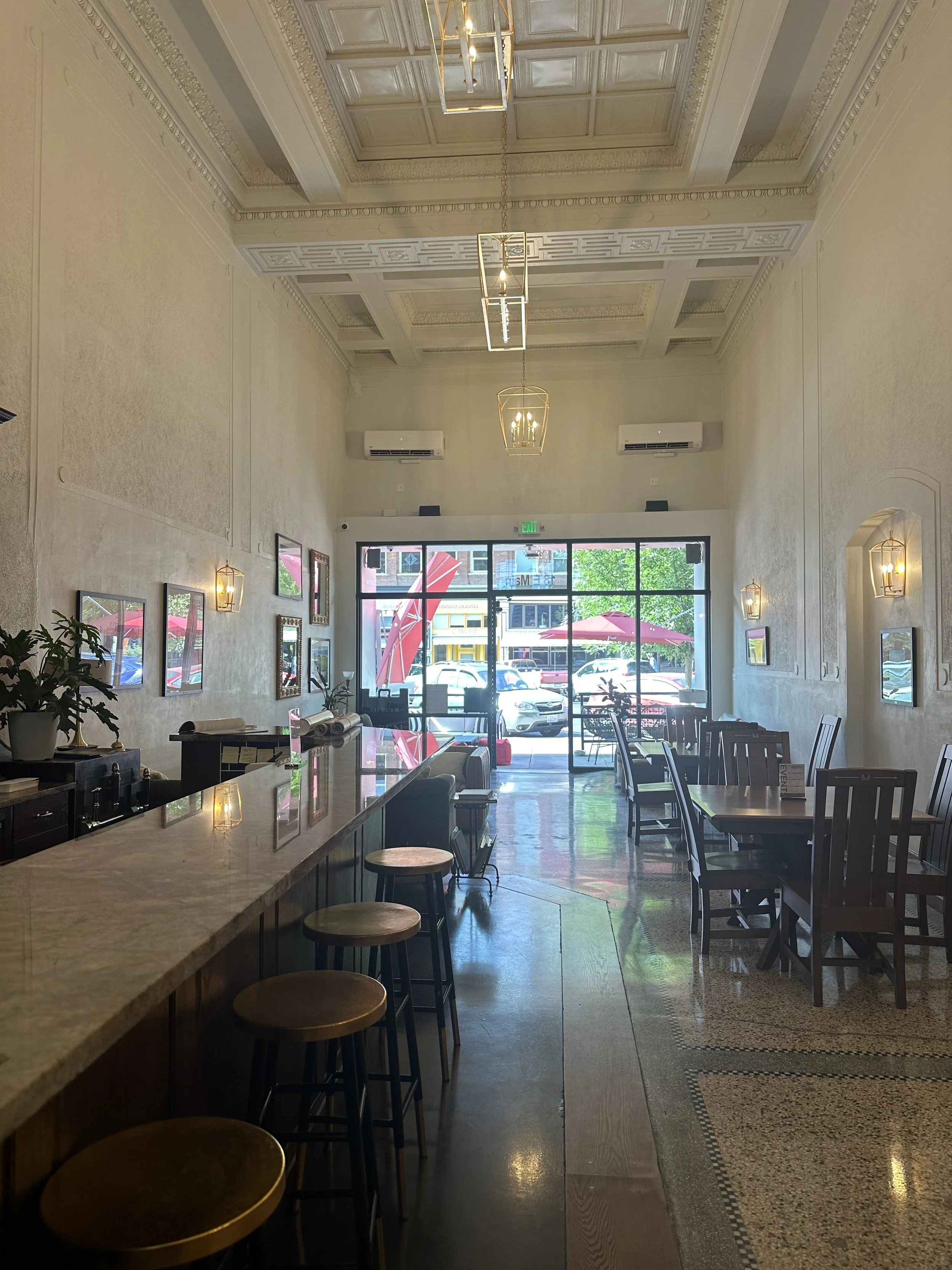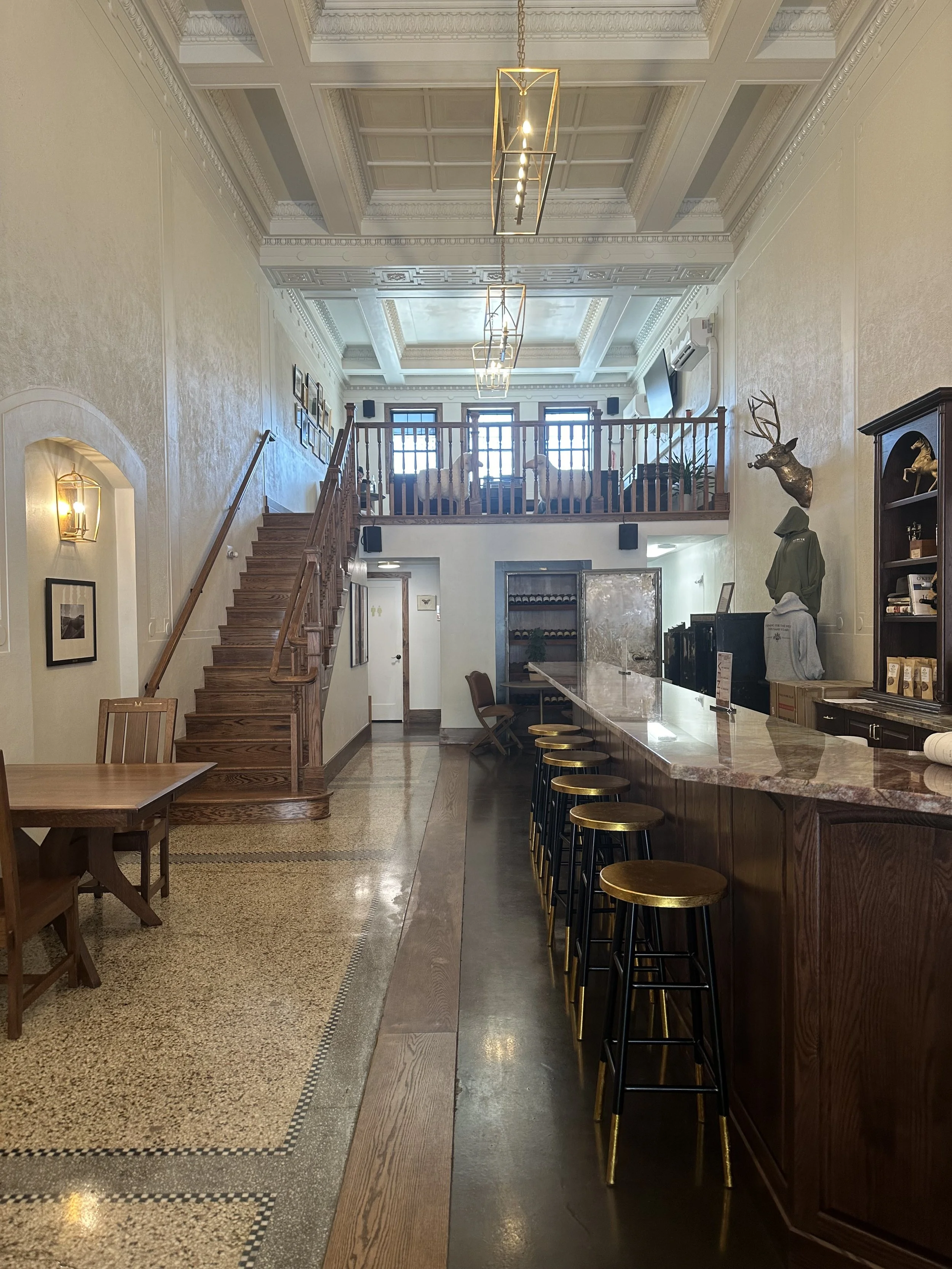 The Mercer family hired Skie Architecture Studio to guide a meticulous restoration and remodel of the historic Martins Jewelers space, originally constructed as Peoples State Bank in 1918, in downtown Walla Walla. This neoclassical gem housed Martin’s Jewelers for 133 years and was progressively altered by the design trends of the 1950s, 1970s, and 1990s: a drop ceiling was installed creating a cave-like mezzanine; the original coffered ceilings were covered and the skylights removed; the original terrazzo marble floors were carpeted; the detailed plaster walls were covered with wood paneling. DeVos Builders carefully uncovered and restored several of these features which are now part of the vibe of the Mercer Wine Estates tasting room. This transformation breathes new life into the neoclassic architecture, preserving its historic charm while repurposing it into an elegant and inviting wine tasting venue. The remodel is a harmonious blend of historical preservation and modern adaptation. This project not only revitalizes a cherished piece of Walla Walla's history but also creates a distinctive and welcoming space that celebrates the region's renowned wine culture.