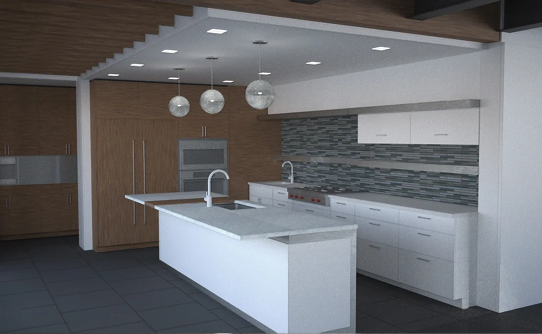 Renderings of the homes exterior and the kitchen were used during the Design Development phase to help facilitate material selections.